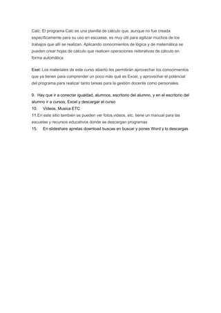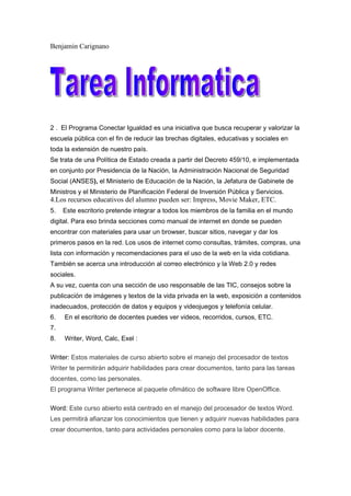 Este documento describe el Programa Conectar Igualdad en Argentina, el cual busca reducir las brechas digitales, educativas y sociales a través de la distribución gratuita de netbooks a estudiantes y docentes de escuelas públicas. Explica que el programa ofrece recursos educativos como programas de ofimática (Impress, Movie Maker) y manuales sobre el uso responsable de la tecnología. También menciona cursos disponibles para programas como Word, Excel, Writer y Calc a través del escritorio del alumno en la página de C