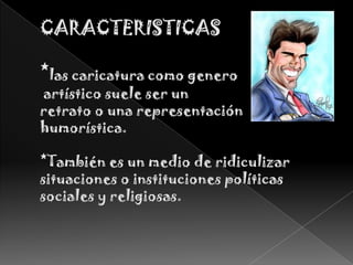 La caricatura nació en Bolonia como un género artístico que exagera los rasgos de una persona para causar comicidad o representar un defecto moral. Tiene la intención de ridiculizar situaciones políticas, sociales y religiosas de forma satírica para alentar el cambio. Existen varios tipos de caricatura como la política, social, costumbrista, simbólica y personal, cada una enfocada en un tema diferente.