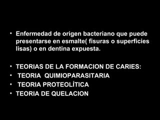 La caries dental es una enfermedad multifactorial causada por la interacción de factores como la microflora bucal, el huésped y los substratos como los carbohidratos. Se desarrolla lentamente a lo largo de meses. La dieta y nutrición juegan un papel importante en la prevención, donde alimentos con flúor y oligoelementos como el zinc y hierro ayudan a prevenir las caries.