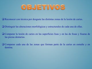 La caries dental es una enfermedad infecciosa que causa pérdida de minerales en los dientes. Se divide en varias zonas según su grado de afectación, desde la zona más profunda hasta la superficie. Es importante distinguir estas zonas para determinar el tratamiento adecuado. Los principales factores de riesgo son la dieta, la higiene bucal y el uso de fluoruro.