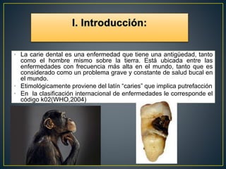 La carie dental es una enfermedad infecciosa causada por la acción de microorganismos sobre los carbohidratos en la dieta, lo que provoca la desmineralización de los tejidos dentales. Es una de las enfermedades más comunes en el mundo. Múltiples factores contribuyen a su desarrollo, incluyendo la dieta, la saliva, la genética y características del diente. Los principales microorganismos involucrados son los lactobacillus, streptococcus mutans y actinomyces, cuya actividad ácida