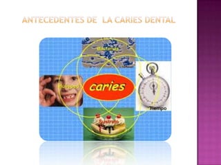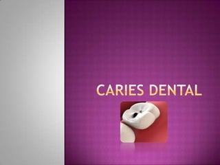 La caries dental es una enfermedad causada por bacterias que forman ácido a partir de azúcares y almidones en la boca, destruyendo el esmalte dental. Es una de las enfermedades más comunes del ser humano y ha aumentado debido a cambios en la alimentación y procesamiento de alimentos. La caries puede no presentar síntomas pero puede causar dolor dental, agujeros visibles u otros síntomas. Las medidas preventivas como el uso de fluoruro, higiene bucal y visitas regulares al dentista pueden aumentar la resistencia dental