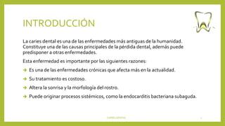 Este documento proporciona información sobre la caries dental. Define la caries dental, describe las teorías sobre su formación y los factores que participan en el proceso carioso como los microorganismos, el sustrato oral, la susceptibilidad del huésped y el tiempo. Explica el mecanismo de acción de la caries en los diferentes tejidos dentales como el esmalte, la dentina y la pulpa, así como diferentes clasificaciones de la caries.