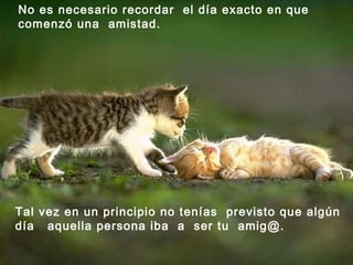 Este documento habla sobre la naturaleza de la amistad y cómo a lo largo del tiempo se desarrolla la confianza y el cariño entre amigos sin proponérselo. También incluye frases sobre valorar a los amigos verdaderos y recordarles cuánto se les quiere.