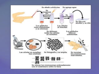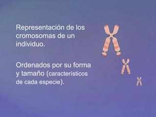 Este documento describe los cromosomas de un individuo, incluyendo su forma y tamaño característicos de cada especie. Explica que los cromosomas se ordenan en 7 grupos (A-G) según su tamaño y posición del centrómero. También describe la técnica para representar los cromosomas usando células en metafase, teñido y fotografía bajo microscopio. Finalmente, menciona que los cariotipos se usan para determinar el sexo y detectar aberraciones cromosómicas.