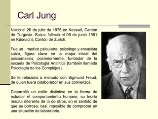 Carl Jung desarrolló una teoría psicológica que incluye conceptos como los opuestos, el inconsciente colectivo e individual, la autorrealización y los arquetipos. Según Jung, la personalidad se desarrolla a través del conflicto entre fuerzas opuestas como la introversión y extraversión. El también propuso que el inconsciente colectivo contiene conocimientos y sentimientos heredados a través de la evolución humana. La autorrealización ocurre cuando se logra un balance entre el yo consciente, el inconsc