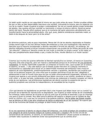 Este documento resume las posiciones encontradas en el debate sobre el aborto. Por un lado, los partidarios de la elección argumentan que la decisión corresponde solo a la mujer, mientras que los "pro vida" sostienen que el embrión tiene derecho a la vida desde la concepción. El documento analiza los argumentos de ambos lados y plantea interrogantes sobre en qué momento se considera que comienza la vida humana y qué distingue a un ser humano de otros seres vivos. Concluye que no hay una respuesta tajante a este complejo debate que involucra