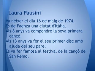 Este documento presenta información biográfica sobre la cantante italiana Laura Pausini, incluyendo detalles sobre su primer disco y su éxito en el festival de San Remo a los 13 años. También analiza la canción "Como si no nos hubiéramos amado", explicando que los padres del autor la consideran su canción favorita porque les recuerda cómo se conocieron.