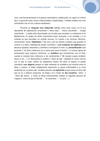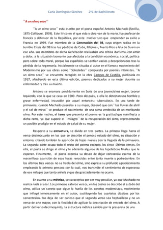 El poema "A un olmo seco" fue escrito por Antonio Machado sobre un olmo que veía renacer después de estar casi muerto. Representa la esperanza que Machado sentía por la enfermedad de su esposa. El poema describe el estado del olmo y luego Machado se dirige a él, imaginando su futuro. Expresa su gratitud por la rama verde renacida y su deseo de que su esposa también se recupere.