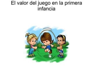 El documento describe la importancia del juego en la primera infancia, explicando que el juego permite a los niños explorar sus fantasías, sentimientos y el mundo que les rodea. A través del juego, los niños aprenden sobre sí mismos, los demás y comparten experiencias en un espacio que media entre la fantasía y la realidad. El juego estimula la imaginación, el aprendizaje y el desarrollo cognitivo y emocional de los niños.
