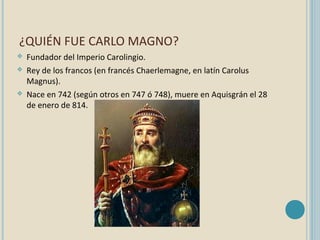 Carlo Magno fue el fundador del Imperio Carolingio en Europa Occidental en el siglo VIII. Gobernó un vasto imperio que se extendía desde la Península Ibérica hasta Hungría e impulsó el Renacimiento Carolingio para mejorar la educación y cultura. Coronado emperador por el Papa en el año 800, Carlo Magno buscó unificar su imperio y promover el cristianismo.