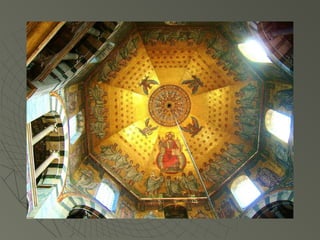 El documento describe la estructura de la sociedad feudal en la Edad Media, con el rey en la cima de la pirámide ofreciendo feudos a los señores a cambio de impuestos y lealtad. Los señores ofrecían bienes de la tierra a los vasallos y proporcionaban justicia y apoyo militar a cambio de lealtad, dinero y servicios. Los vasallos menores apoyaban la tierra del señor con dinero, servicio militar y lealtad. Los siervos brindaban servicios a los caballeros y al se