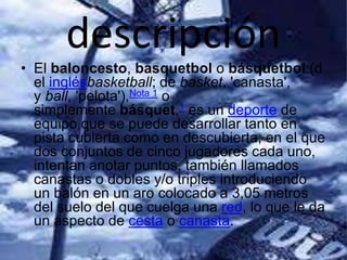 El documento describe el deporte del baloncesto. Se juega entre dos equipos de cinco jugadores cada uno, con el objetivo de anotar puntos introduciendo un balón en un aro de 3.05 metros de altura. Un partido está compuesto por cuatro períodos de 10 minutos en la FIBA o dos períodos de 20 minutos en la NCAA. Cada equipo puede presentar hasta 12 jugadores, cinco iniciales y siete suplentes, que pueden ser cambiados durante el juego.