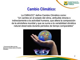 El documento discute el cambio climático y su impacto en los sectores minero y energético en Perú. Define el cambio climático como un cambio en el clima atribuido a la actividad humana. Explica que Perú es vulnerable al cambio climático debido a su biodiversidad, pobreza y dependencia de la agricultura. Sin embargo, las emisiones de gases de efecto invernadero de Perú son bajas a nivel mundial y provienen principalmente de la deforestación y agricultura. Los sectores minero y de hidrocarbu