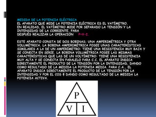 El documento describe que el vatímetro mide la potencia eléctrica mediante la medición por separado de la tensión y la intensidad de corriente para luego calcular la potencia como el producto de voltaje por corriente. El vatímetro consta de dos bobinas, una para medir la intensidad y otra para medir el voltaje.