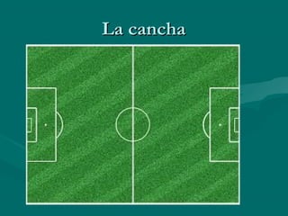 El documento describe las características básicas de un campo de fútbol, incluyendo sus medidas, líneas y áreas clave como el área penal y la portería. También describe las principales posiciones de jugador como guardameta, defensa, centrocampista y delantero, así como algunas reglas básicas como la recepción y el pase del balón. Por último, menciona brevemente los orígenes del fútbol en juegos populares medievales en Europa.
