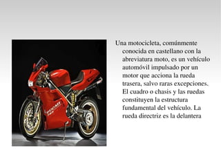 Este documento resume la historia y evolución de las motocicletas. Explica que originalmente eran impulsadas por motores de vapor o combustión y ahora algunas usan electricidad. Detalla las partes principales de una moto como el motor, transmisión, chasis, frenos y suspensión. También cubre los diferentes tipos de motocicletas como deportivas, choppers y motos de carreras.