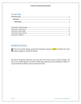 Carlos Kasuga, un empresario mexicano con cultura japonesa y mexicana, dio un discurso sobre el trabajo en equipo. Habló sobre la importancia de la educación, la religión y la actitud hacia la vida. También proporcionó consejos para ser un buen empresario como ser honesto, puntual y disciplinado, hacer las cosas bien, y dar más de lo que se recibe. Finalmente, enfatizó la necesidad de crear una mentalidad de triunfadores en México en lugar de una mentalidad de fracasados.