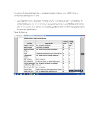 El documento habla sobre las licencias de software, explicando que son contratos entre el licenciante (propietario del software) y el licenciatario (usuario) que establecen los términos de uso del software. Describe los diferentes tipos de licencias como software libre, de código abierto y propietario, así como las organizaciones Free Software Foundation y Open Source Initiative dedicadas a promover el software libre y de código abierto.