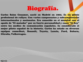 Carlos Sainz es un piloto español de rally considerado el mejor de la historia de España. Tuvo una larga carrera donde ganó 2 campeonatos nacionales y 2 mundiales, compitiendo para marcas como Seat, Renault, Toyota, Ford y Citroën. Después de retirarse en 2004, continuó compitiendo en el Rally Dakar, donde ganó en 2010, siendo el primer español en lograrlo. Actualmente trabaja como piloto probador para Volkswagen.