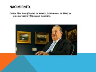 Carlos Slim Helú nació en 1940 en la Ciudad de México en una familia libanesa. Se graduó como ingeniero civil de la UNAM y comenzó a invertir en bienes raíces y compra de negocios desde una edad temprana. En la década de 1980, durante una crisis económica en México, Slim y su grupo realizaron fuertes inversiones en el país y adquirieron varias empresas. Actualmente, Carlos Slim tiene una fortuna estimada en $69 mil millones de dólares, lo que lo convierte en el hombre más rico