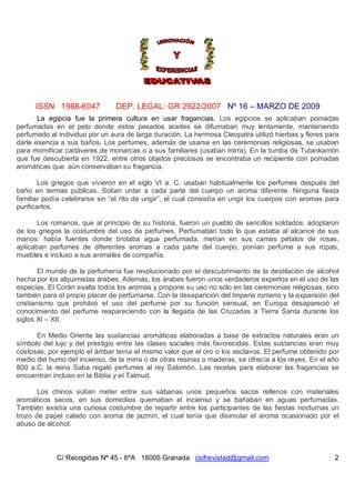 Este artículo describe métodos para elaborar perfumes en el laboratorio escolar, incluyendo la historia del perfume, tipos de perfumes, y métodos para extraer aceites esenciales como la destilación por vapor, enfleurage e extracción con solventes. Se proporcionan detalles sobre cada método y ejemplos de cómo podrían llevarse a cabo en el laboratorio escolar.