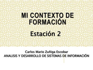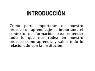 El documento describe el contexto de formación del SENA. El SENA tiene la misión de ofrecer formación profesional integral para contribuir al desarrollo de Colombia. Su visión es ser una entidad líder mundial en formación profesional para el 2020. El escudo y la bandera representan los sectores económicos en los que trabaja el SENA. El rol del aprendiz es ser responsable de su propio aprendizaje, mientras que el tutor lo orienta en el proceso formativo.