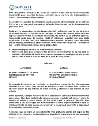 Este documento resume 15 áreas clave de cambio que han ocurrido en el campo de la administración del mantenimiento durante los últimos 15 años. Cada área de cambio se presenta a través de dos máximas, la primera describe cómo solían ser las cosas y la segunda cómo son ahora o deberían ser. El objetivo es proveer una guía rápida sobre los cambios y servir de base para comparar diferentes enfoques de mantenimiento como RCM y TPM.