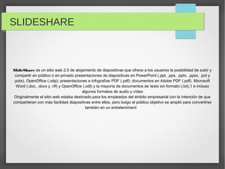 Este documento describe SlideShare, un sitio web que permite a los usuarios subir y compartir presentaciones de diapositivas, documentos PDF y de texto. Originalmente estaba destinado a empleados para compartir presentaciones de trabajo, pero ahora también se usa para entretenimiento. Explica los 7 pasos para crear una cuenta en SlideShare: 1) ingresar a la página web, 2) hacer clic en "signup", 3) llenar datos personales, 4) continuar ingresando datos, 5) hacer clic en "Sign up", 6) confirmar el correo electrónico,