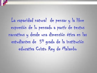 Este documento describe un proyecto para estimular la capacidad de pensamiento y expresión a través de textos narrativos en estudiantes de 5o grado en la Institución Educativa Cristo Rey en Malambo, Colombia. Diagnostica las características y dificultades de los estudiantes y propone desarrollar habilidades como la atención, creatividad y motivación a través de actividades de lectura, diálogo y representación. Los objetivos son fomentar ambientes de comunicación ética y ejercitar procesos cognitivos, con la participación