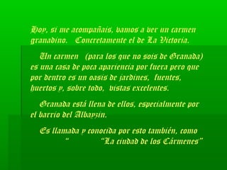 Este documento describe una visita a un carmen en Granada llamado La Victoria. Un carmen es una casa típica de Granada con jardines y fuentes internas que ofrecen vistas excelentes de la ciudad. El documento guía al lector a través de la ruta para llegar a este carmen, pasando por lugares notables como la iglesia de Santa Ana y el río Darro, hasta llegar al carmen que ahora es una residencia de estudiantes con vistas espectaculares de la Alhambra.