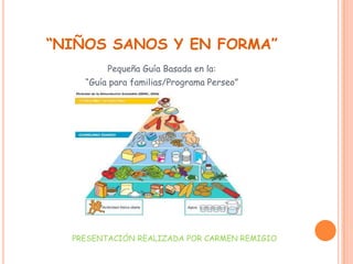 Este documento presenta consejos para ayudar a los niños de 6 a 12 años a desarrollar hábitos alimenticios y de actividad física saludables. Recomienda que los niños realicen al menos 1 hora de ejercicio al día, coman 5 porciones de frutas y verduras diarias, limiten el consumo de dulces y comidas rápidas, y desayunen completamente. Además, enfatiza la importancia de que las familias tomen hábitos saludables y pasen tiempo juntos haciendo actividades al a