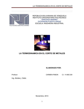 Este documento trata sobre la termodinámica en el corte de metales mediante el uso de herramientas de corte. Explica que el corte de metales involucra la remoción de virutas metálicas y describe los tres tipos de virutas que se pueden formar. También describe los diferentes tipos de herramientas de corte y materiales empleados como aceros de alto contenido de carbono, aceros de alta velocidad, aleaciones fundidas no ferrosas y carburos; y sus propiedades termodinámicas relevantes para