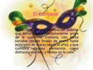 Este documento describe las tradiciones y celebraciones del Carnaval en varias ciudades del Ecuador, incluyendo Imbabura, Ambato, Guaranda, Cuenca, Quito, Esmeraldas y Cañar. En cada ciudad, el Carnaval se caracteriza por desfiles, comparsas, bailes, música y el uso de elementos como agua, flores y frutas. El objetivo es atraer turismo y celebrar la cultura local a través de las festividades carnavalescas.