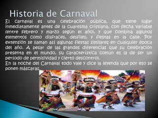 Este documento presenta información sobre el carnaval, incluyendo sus orígenes en celebraciones paganas, su asociación con países católicos, y algunos de los carnavales más famosos del mundo como los de Río de Janeiro y Oruro.