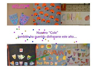 El documento describe las diferentes transformaciones que ha experimentado el colegio "La Corolla" durante las celebraciones de Carnaval este año. En un primer momento, el colegio se convirtió en una carroza real transportando reyes y reinas. Luego, el colegio tomó la forma de un barco pirata y de un saloon del viejo oeste. Más tarde, el colegio se transformó en un museo con cuadros que cobraban vida y en una granja con diferentes animales bailarines. El documento concluye deseando un feliz carnaval.