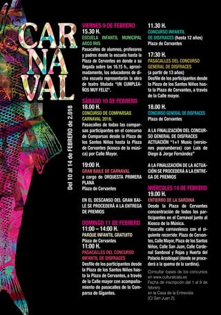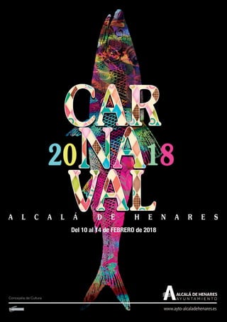 El documento detalla los eventos del carnaval que se llevarán a cabo entre el 10 y el 14 de febrero en Alcalá de Guadaíra, incluyendo desfiles de comparsas, bailes, concursos de disfraces para niños y adultos, y el entierro de la sardina. Los eventos tendrán lugar en varias plazas y calles principales de la ciudad y están organizados por el Ayuntamiento.