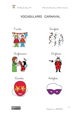 Actividades de lectoescritura para trabajar el Carnaval, con vocabulario, ordena frases, cuenta sílabas y letras, singular y plural, redacción y dibujo.
