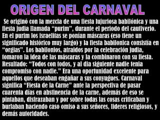 El carnaval se origina de la mezcla de fiestas babilónicas y judías, representando una época de permisividad donde se celebran excesos y se ignoran las autoridades. Esta 'fiesta de la carne' está asociada a la indulgencia en pecados como la promiscuidad y el consumo de alcohol, y se contrapone a los principios espirituales del ayuno y la autoridad divina. A lo largo del texto, se enfatiza que estas prácticas carnales son contrarias a la vida espiritual y a los mandamientos de Dios.