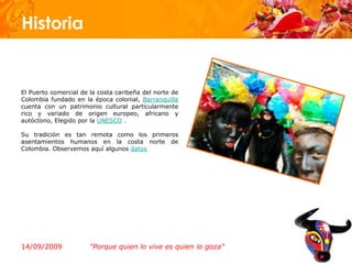 El Carnaval de Barranquilla, un evento declarado Patrimonio Cultural de la Humanidad por la UNESCO, refleja una rica herencia cultural de influencias europeas, africanas y autóctonas. El carnaval incluye diversas manifestaciones artísticas como comparsas, danzas y disfraces, con la participación de más de 1.3 millones de personas en sus eventos. Además, el programa 'Carnaval al Aula' busca educar musicalmente a niños de escuelas públicas, promoviendo la tradición y la calidad de vida en la comunidad.