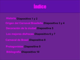 Este documento resume la historia y orígenes del carnaval brasileño, así como sus principales características. Se celebra principalmente en Río de Janeiro, Salvador de Bahía y São Paulo, con desfiles de escuelas de samba y blocos por las calles y sambódromos. Tiene sus raíces en antiguas celebraciones paganas para honrar a dioses y espantar demonios, y hoy es una expresión central de la cultura e identidad brasileña.