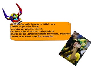 El documento describe el Carnaval de Brasil, la mayor fiesta popular del país. Se celebra principalmente en Río de Janeiro, donde desfilan las escolas de samba a lo largo de la pasarela del Sambódromo para 90.000 espectadores. El Carnaval tiene sus orígenes en las tradiciones europeas y portuguesas de juegos con agua y grupos que bailaban por las calles. Otras ciudades como Salvador de Bahía y Parintins también celebran el Carnaval con sus propias tradiciones.