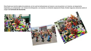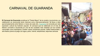 El Carnaval de Guaranda es la fiesta mayor de la ciudad y provincia, que se celebra entre febrero y marzo cada año. Esta expresión cultural de tradición popular atrae muchos turistas nacionales y extranjeros a Guaranda. El carnaval combina las culturas indígena y mestizo-europea y representa los días antes de la Cuaresma, usando gran cantidad de agua en referencia a la fertilidad de la tierra.
