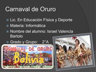 El documento resume la historia, actualidad y reconocimiento del Carnaval de Oruro como Patrimonio de la Humanidad. El Carnaval celebra la Virgen de la Candelaria y combina tradiciones paganas y cristianas. Actualmente atrae a cientos de miles de espectadores y participantes que bailan y cantan en honor a la Virgen del Socavón durante tres días.