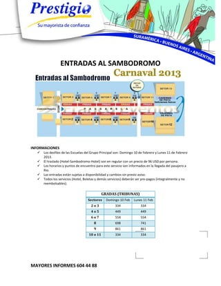 Este documento presenta un programa de viaje al Carnaval de Río de Janeiro en 2013, incluyendo alojamiento en hoteles de 3 a 5 estrellas, desayunos, visitas a Pan de Azúcar y Corcovado, y traslados desde y hacia el aeropuerto. También incluye información sobre entradas al Sambódromo para los desfiles del 10 y 11 de febrero, con precios que van desde $334 a $861 dependiendo de la ubicación. Se proporcionan notas importantes sobre precios, cambios, pagos y cancelaciones.
