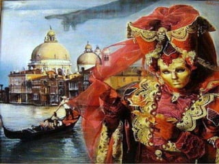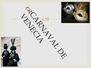 El documento resume el Carnaval de Venecia. Se celebra anualmente durante 10 días antes de la Cuaresma y se caracteriza por el uso de máscaras y disfraces del siglo XVII veneciano. La gente sale a la calle a pasear disfrazada y hacerse fotos. El clima en febrero suele ser frío, por lo que es recomendable ir abrigado.