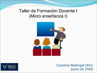 Este documento presenta un taller de formación docente que se enfoca en desarrollar las competencias de organización, comunicación e inducción a través de módulos que incluyen presentaciones, ejercicios y retroalimentación. El taller tiene como objetivo fortalecer las habilidades docentes y aplicar estas tres competencias básicas a través de una pequeña exposición.