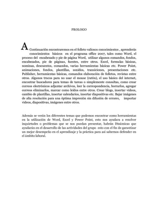 Este documento proporciona una introducción a las herramientas básicas de Office 2007 como Word, Excel y PowerPoint. Explica cómo insertar encabezados, pies de página, imágenes prediseñadas e hipervínculos en Word. También cubre el uso de letras capitales, combinaciones de correspondencia y la creación de columnas. La introducción incluye una breve historia de los computadores y sus generaciones.