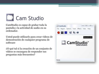 El documento presenta 10 programas de software libre útiles, incluyendo CamStudio para grabar la pantalla, Ares para descargar archivos P2P, VLC Media Player para reproducir videos y música, Pidgin para mensajería instantánea multiplataforma, OpenOffice como suite de oficina, Blender para crear gráficos 3D, Virtual DJ para mezclar música, Visual Biblioteca para gestionar libros, VirtualDub para editar videos, e Inkscape para edición de gráficos vectoriales.
