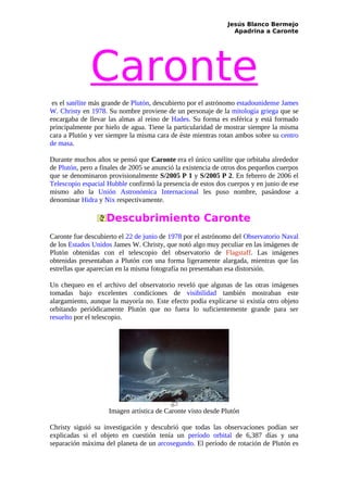 Caronte es el mayor satélite de Plutón. Fue descubierto en 1978 y nombrado así por el personaje mitológico que transportaba las almas al reino de Hades. Orbita cerca de Plutón y muestra siempre la misma cara hacia él, al igual que Plutón. Se cree que Plutón y Caronte colisionaron en el pasado y quedaron atrapados en órbita mutua. Existe debate sobre si Caronte debería considerarse un satélite o un planeta enano, debido a que orbitan el centro de masas común